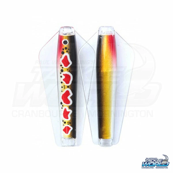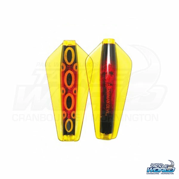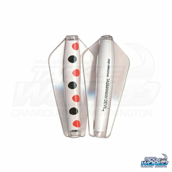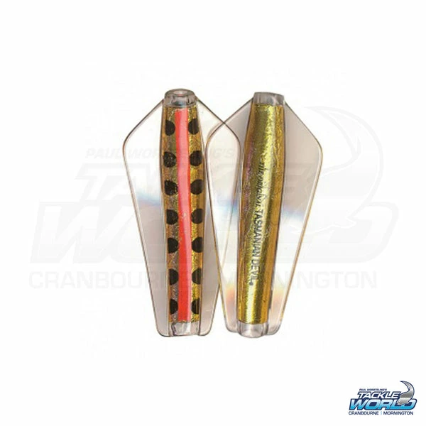 Tasmanian Devil lures are a unique Australian product designed for trolling, casting or jigging in fresh and saltwater. The lure action is due to the revolutionary winged technology that causes the lure to swim in an irregular manner, darting and diving, simulating the movement of wounded fish. This pulsating action is transmitted to the rod tip that will show as a nodding action, that is proof that the lure is swimming correctly. If this rod tip action is not present, either a piece of weed, or a fish is on the hook. All five sizes of the Tasmanian Devil swim in this erratic manner and this is the reason our lures are so effective. The loose flight stainless steel centre or the line-through rigging method used with the 7, 13.5, 20 or 26 gram version prevents fish from throwing the hook as both methods allow the lure body to slide up the line away from the fish. Regardless of the species that is targeted, the Tasmanian Devil qualifies as an all round lure. Whatever your quarry, from Brown trout and Rainbow trout to School Mackerel and Salmon, the Tassie Devil is a sure fire hit and will land you your target species time and time again. Effortless to cast, simple to troll and easy to jig.