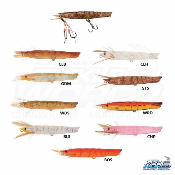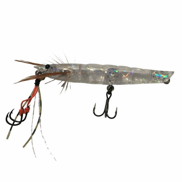 These Japanese made top water lures imitate a shrimp that all game fish love to eat. Cast and use a twitching action to make the Ebi Panic lure act as if it is in ‘panic’ escaping from its predators. It creates a dog walk action and its tail cup generates a sweet popping sound and precise splash, sounding and looking like a skipping shrimp.