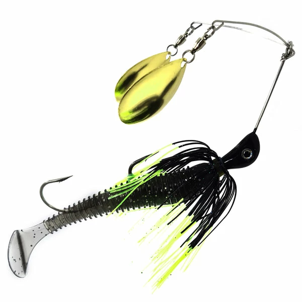 The Bassman Codman DT stands for Double Trouble. This lure is a Big Murray Cod spinnerbait with twin arms that hold double Colorado blades. This setup gets maximum vibration and also a lot of lift so the need for a slow retrieve is crucial. Also this fishβs great on the drop, by this I mean as it helicopters to the bottom both blades are working as soon as it hits the water.