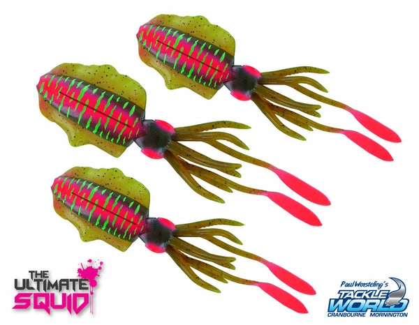 Designed to be the most realistic Squid ever made. The wings will mesmerize you with the most realistic roll and swim action just like a real squid. With custom 3D squid eyes, custom scent, contracting tentacles and extended candles that flutter with any movement. Add the ULTIMATE SQUID to a drop rig, use as an addition to a jig or just add a jig head. The options are endless. The ULTIMATE SQUID, we believe, is one of the most adaptable and realistic squid lures every made.