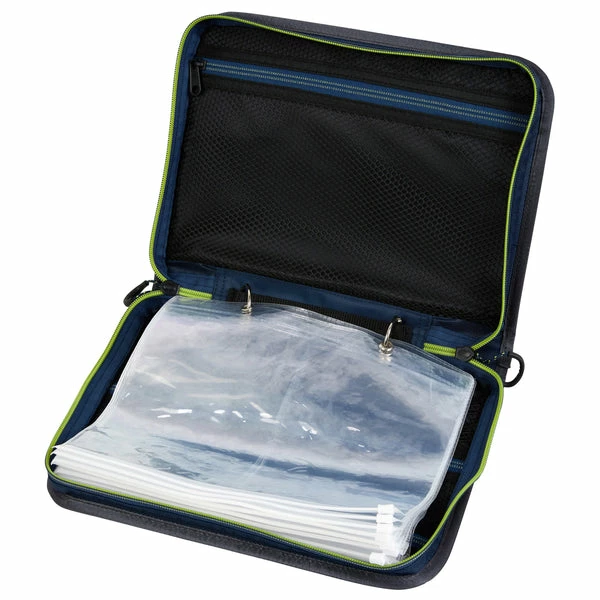 The Shimano Lure Wallet is designed to keep your lures and accessories organised in one place. Constructed from a hardwearing 420D polyester fabric and sealed with non-corrosive nylon zippers, the Shimano Lure Wallet offers unrivalled water resistance and durability. Once opened, 9 plastic zip lock plastic sleeves are ring bound to the spine, offering expandable storage for your soft plastic collection. Additionally, the inside surface is fitted with a number of net lined compartments that offer additional storage for jigheads, scents and other lure accessories.